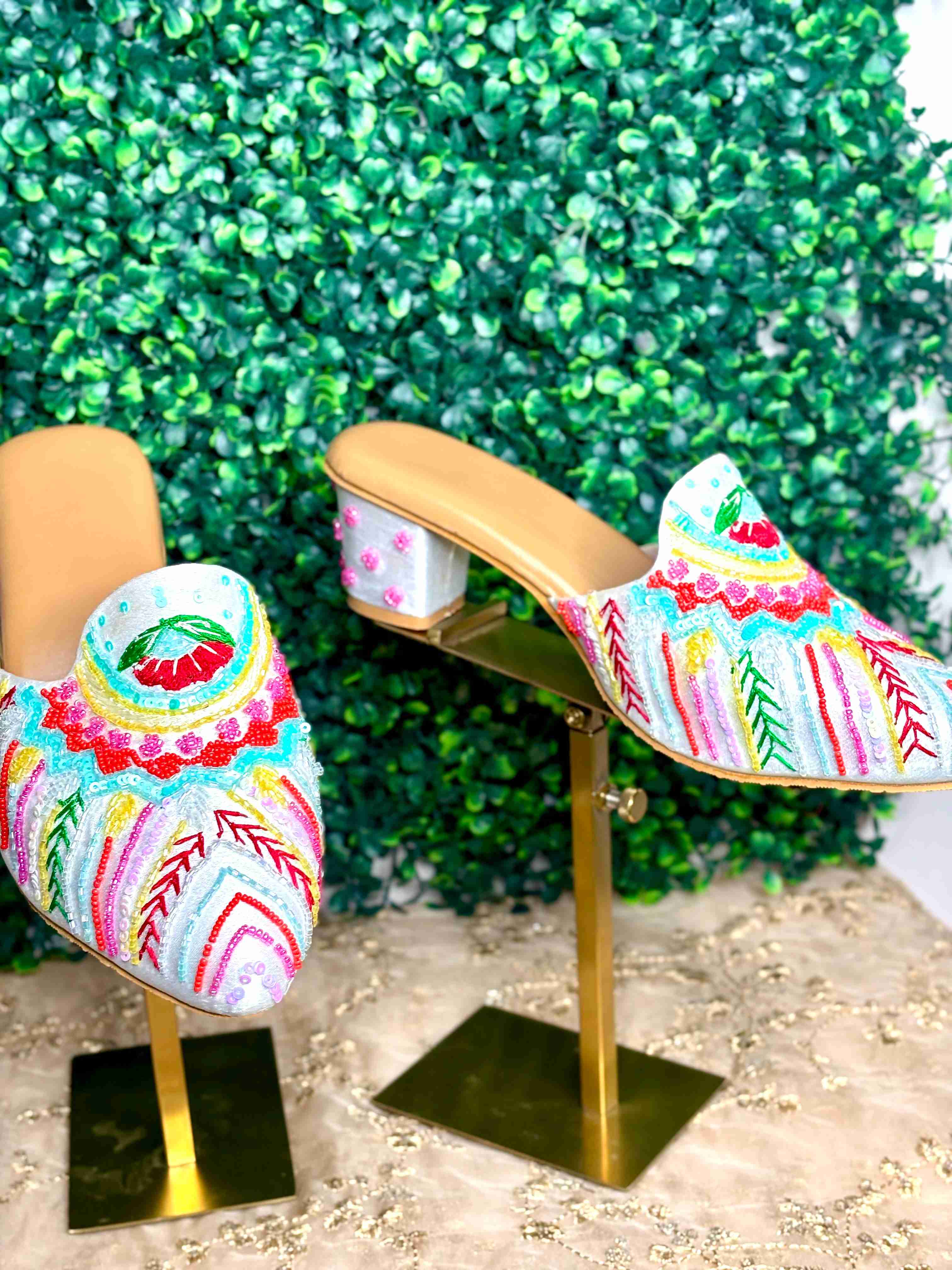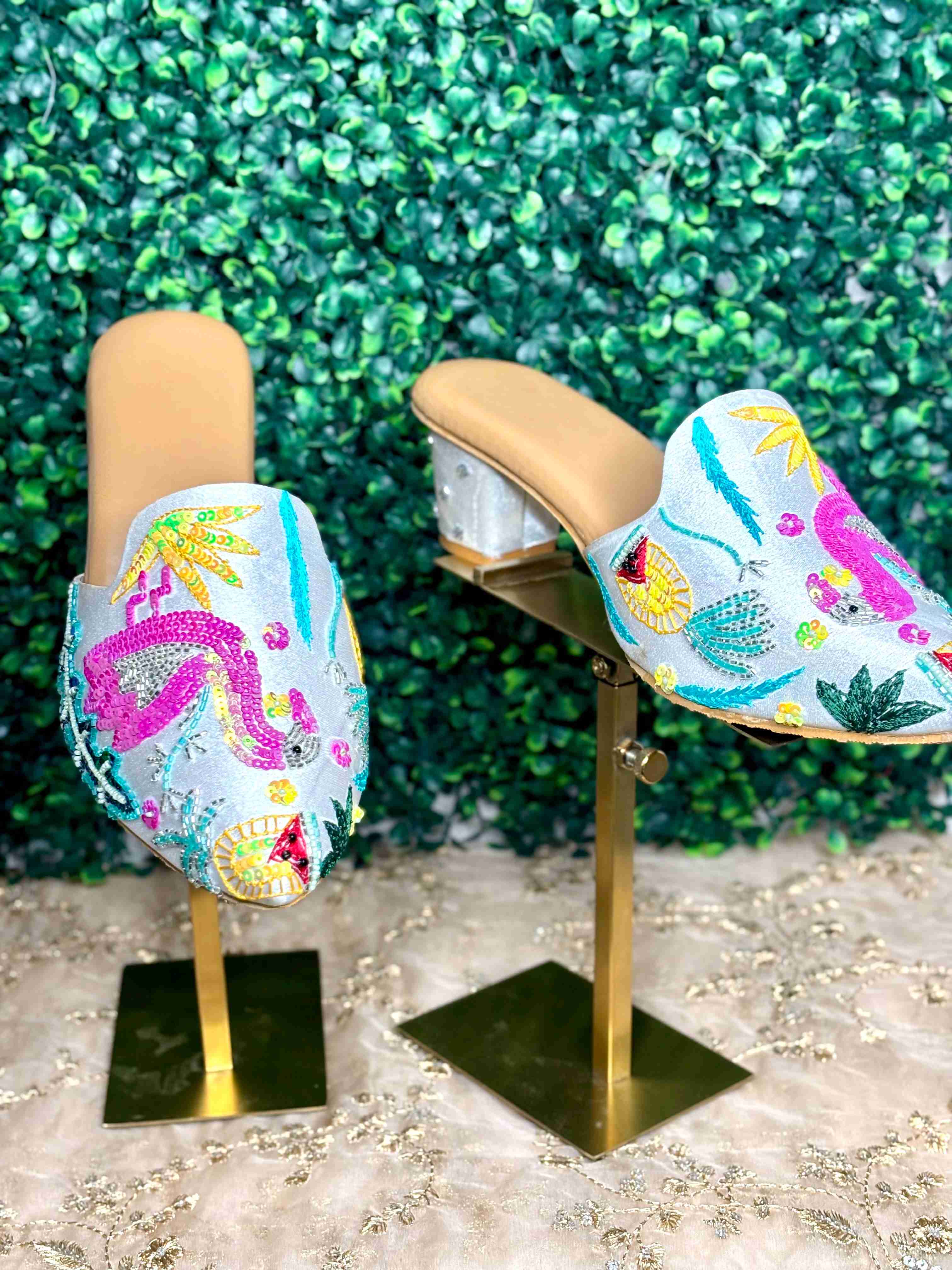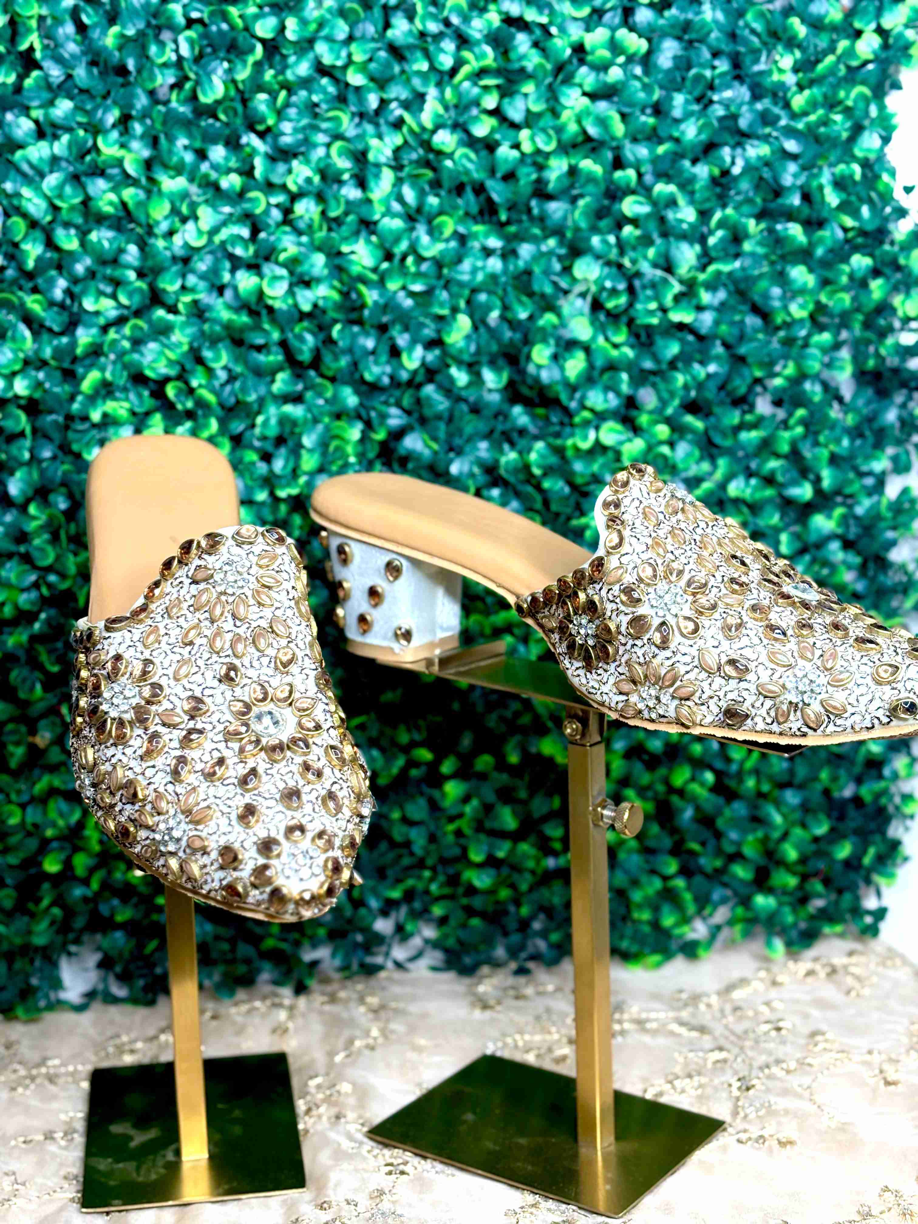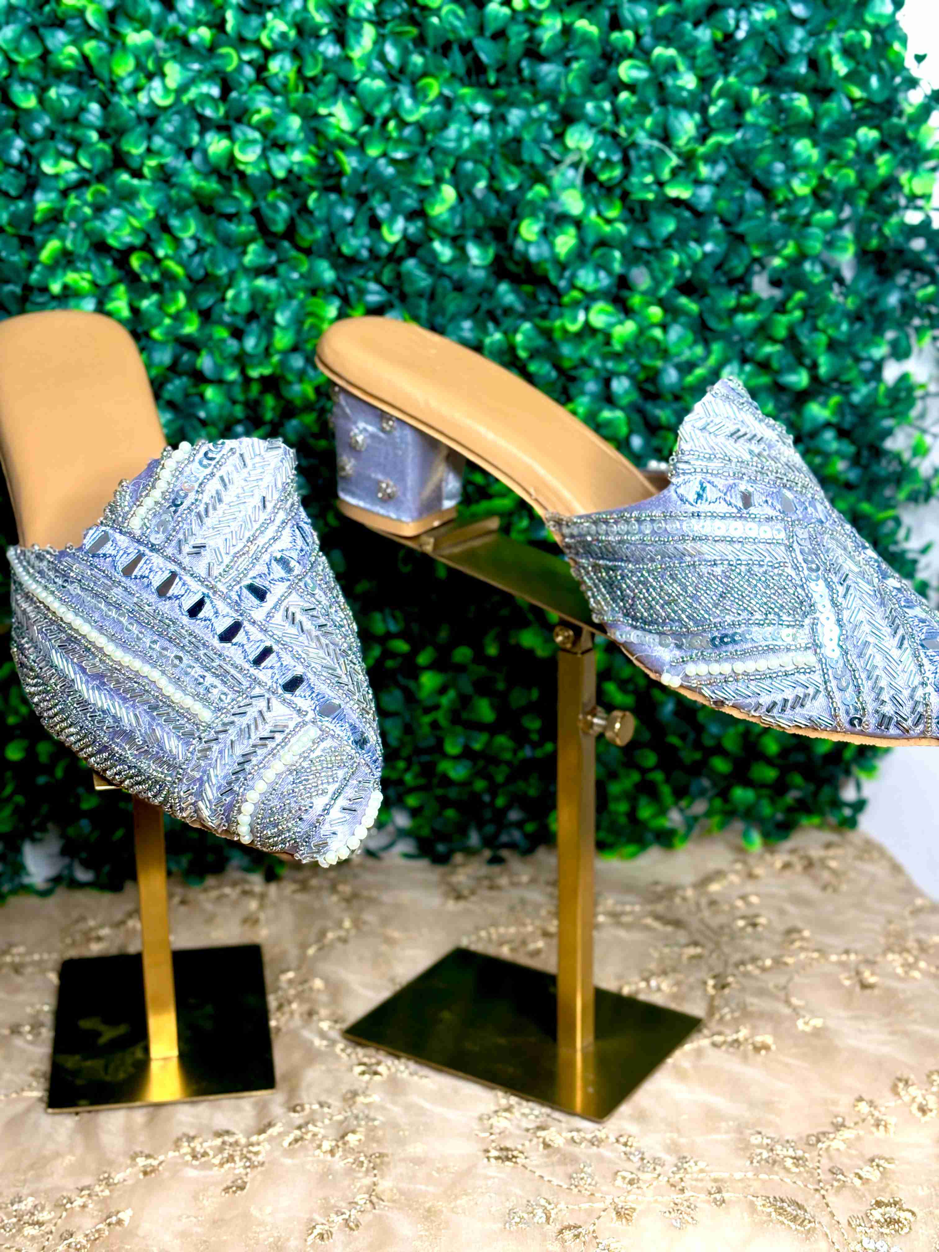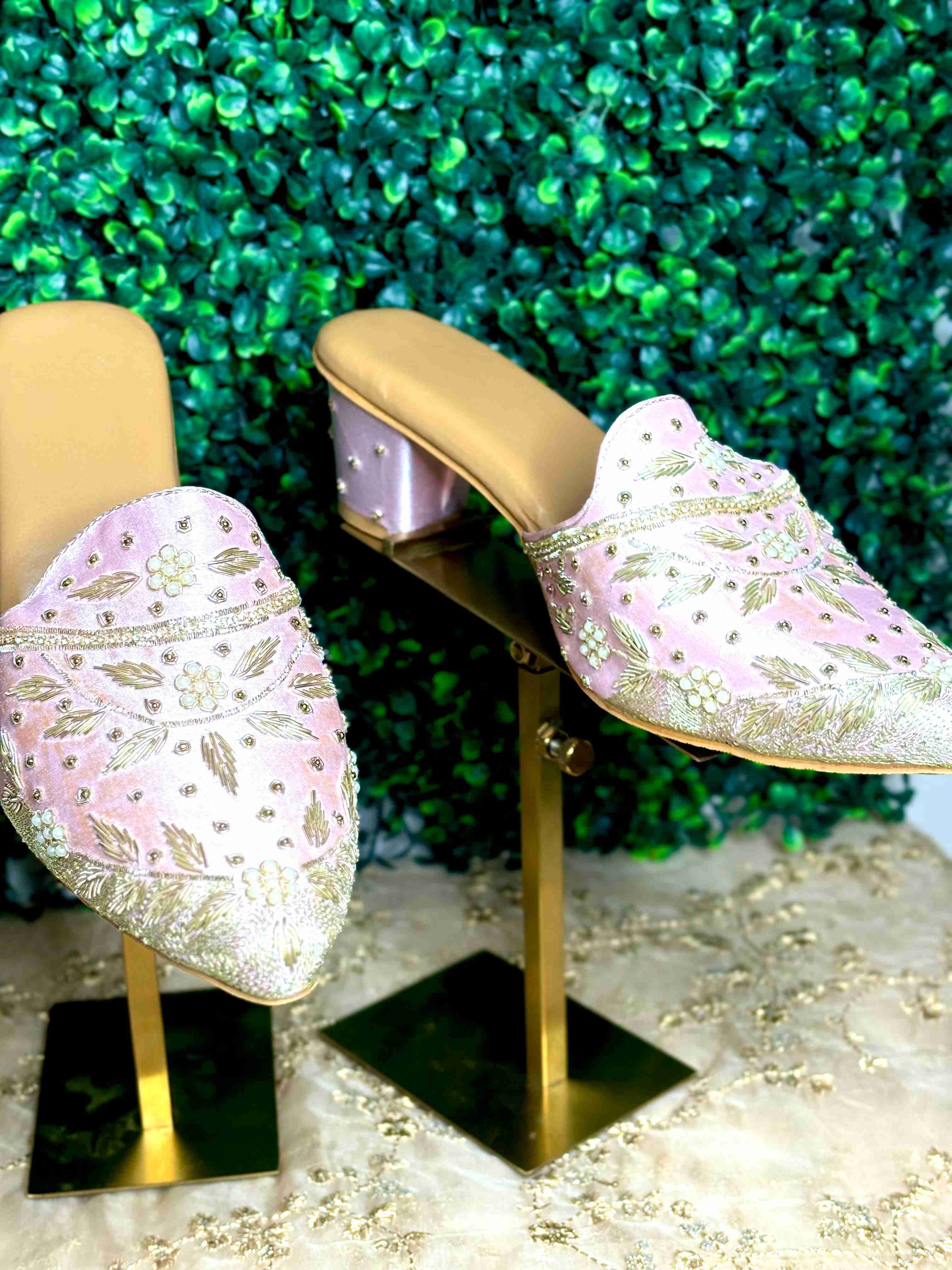 Elevate your style with these stunning Opulent Golden Mules. Perfect for weddings, festive occasions, or any event where you want to make a dazzling statement, these handcrafted shoes combine traditional artistry with modern elegance. Key Features: Intricate Hand-Embroidery: The rich golden fabric is adorned with exquisite, shimmering embroidery featuring a central floral motif. Delicate Embellishments: Pearlescent beads and subtle gold sequins are meticulously hand-stitched, catching the light with every step. Comfortable & Chic Heel: Featuring a stable, medium-height block heel with a unique metallic finish, offering both lift and all-day comfort. Versatile Design: The slip-on mule design is effortlessly chic and pairs beautifully with traditional wear (like saris or lehengas) as well as contemporary evening attire. Experience the blend of luxury and heritage. These golden beauties are more than just footwear—they are a piece of wearable art, designed to complete your most glamorous look.